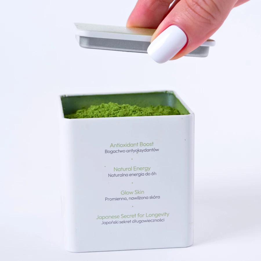Matcha znajduje się w wygodnej puszce, która nie tylko chroni świeżość i aromat herbaty, ale też dodaje elegancji całemu zestawowi. Puszka została zaprojektowana tak, aby przechowywać matchę, minimalizując kontakt z powietrzem i światłem, co pozwala zachować intensywny zielony kolor i pełnię smaku matchy. Dla optymalnej jakości i długotrwałej świeżości zaleca się przechowywanie matchy w lodówce - dzięki temu każdy napar będzie równie aromatyczny i aksamitny jak podczas pierwszego użycia.